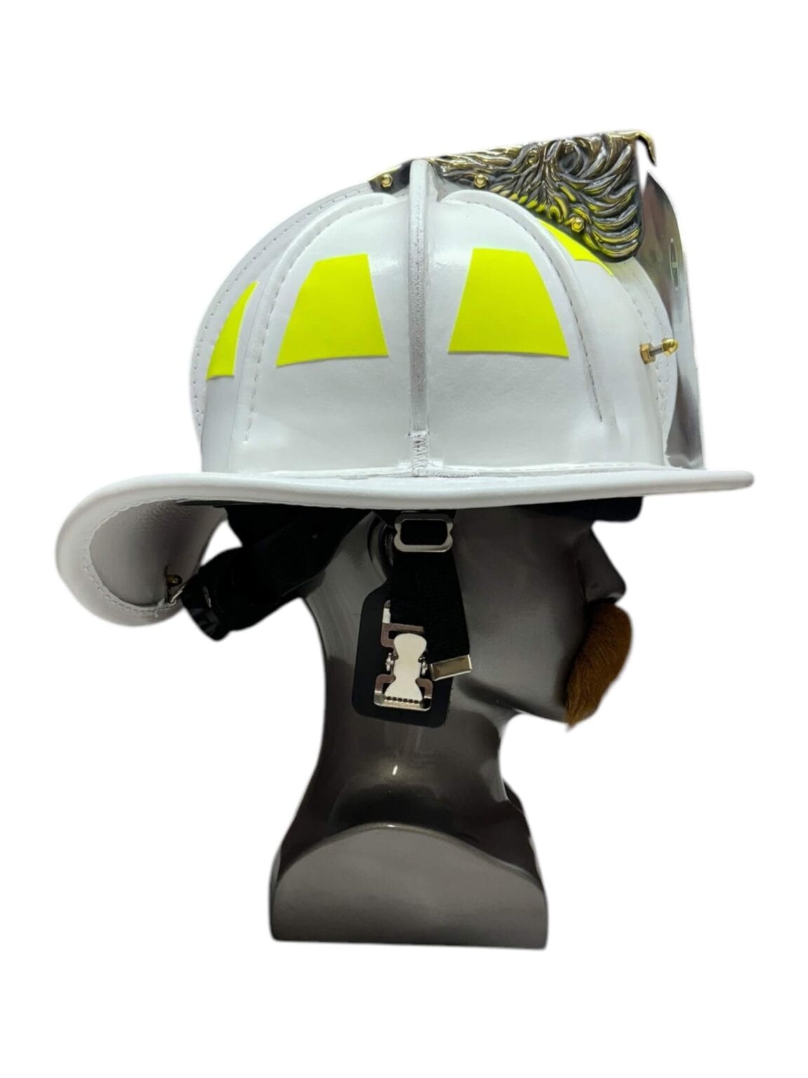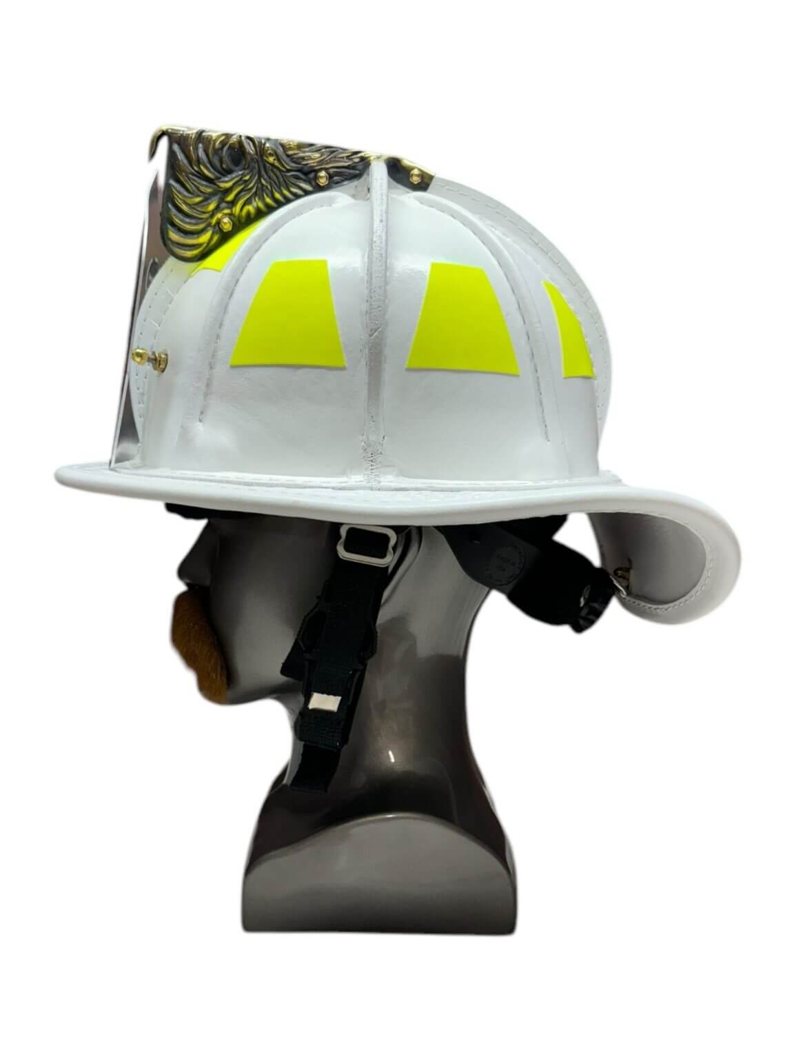 Featuring a low-profile design with adjustable six-point suspension, flame-retardant Nomex liner for sweat-free shifts, and an integrated amber visor for glare-free visibility in smoke-filled chaos. The crisp white shell stands out for quick identification on scene, customizable with brass eagles, reflective trim, or department emblems in bold contrasts.